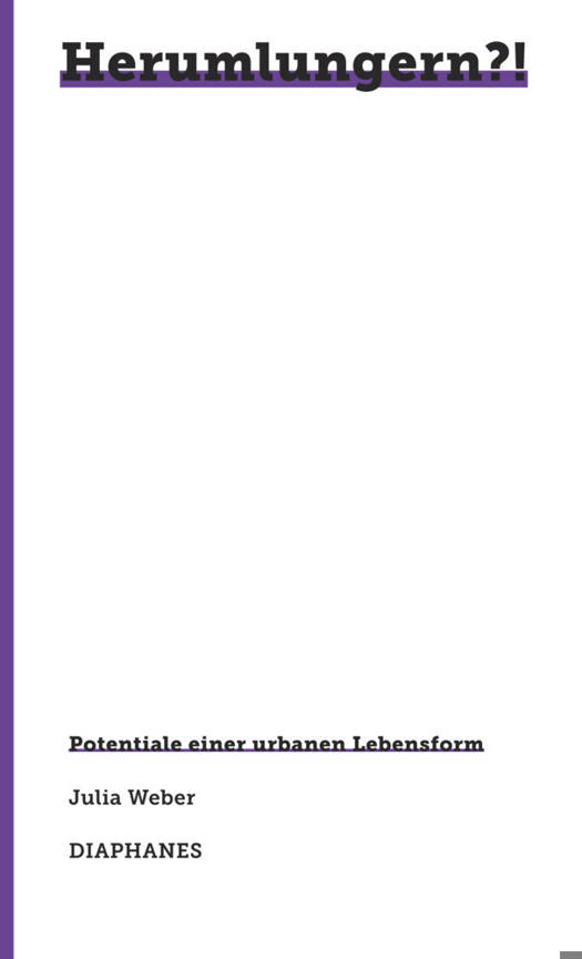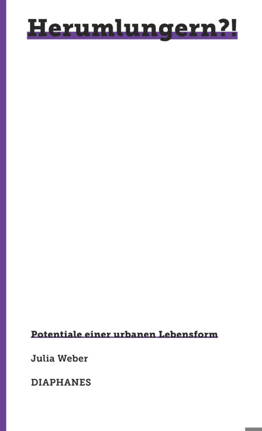 Was bedeutet Herumlungern? Herumlungern als öffentliche Alltagspraxis entzieht sich einer eindeutigen Definition. Seine Bedeutung oszilliert zwischen potentieller Passivität und Aktivität, zwischen Harmlosigkeit und Verdächtigkeit. In ihrer ethnografisch-künstlerischen Forschung geht Julia Weber dem mehrdeutigen Potential des Herumlungerns auf den Grund. Das Herumlungern ist dabei sowohl Erkenntnissubjekt wie auch methodisches Vorgehen. Sie lungerte mit einem Dichter und einer Gruppe langzeiterwerbsloser Menschen in Berlin sowie mit Raver:innen in Zürich über längere und kürzere Zeit herum. Durch die mimetische (An)Teilnahme zeigt sich, wie sich städtische Orte (um)deuten und in selbstbestimmte Räume des Austauschs und der Zugehörigkeit transformieren lassen. In der Rolle als Herumlungernde griff sie selber an ausgewählten städtischen Orten in Berlin und Zürich ins Alltagsleben ein und stellte diese Praxis öffentlich zur Diskussion.