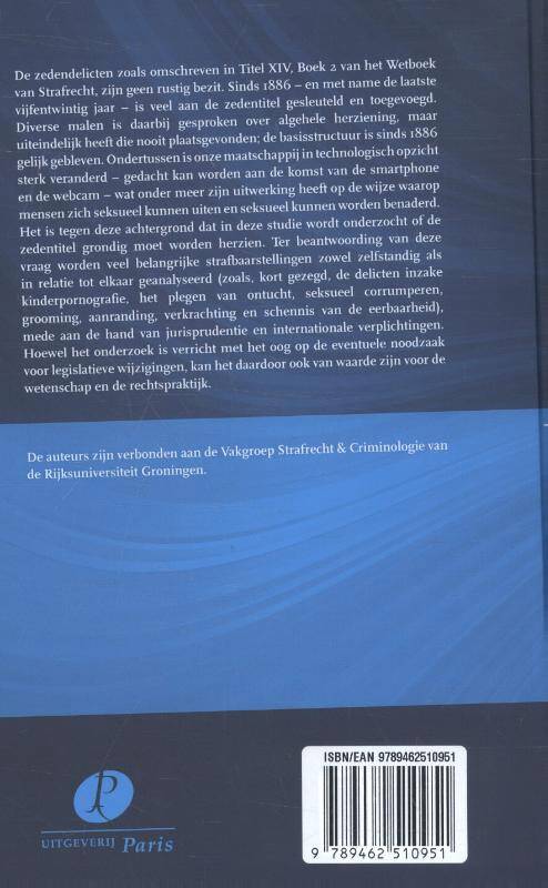 De zedendelicten zoals omschreven in Titel XIV, Boek 2 van het Wetboek van Strafrecht, zijn geen rustig bezit. Sinds 1886 - en met name de laatste vijfentwintig jaar - is veel aan de zedentitel gesleuteld en toegevoegd. Diverse malen is daarbij gesproken over algehele herziening, maar uiteindelijk heeft die nooit plaatsgevonden; de basisstructuur is sinds 1886 gelijk gebleven. Ondertussen is onze maatschappij in technologisch opzicht sterk veranderd - gedacht kan worden aan de komst van de smartphone en de webcam - wat onder meer zijn uitwerking heeft op de wijze waarop mensen zich seksueel kunnen uiten en seksueel kunnen worden benaderd. Het is tegen deze achtergrond dat in deze studie wordt onderzocht of de zedentitel grondig moet worden herzien. Ter beantwoording van deze vraag worden veel belangrijke strafbaarstellingen zowel zelfstandig als in relatie tot elkaar geanalyseerd (zoals, kort gezegd, de delicten inzake kinderpornografie, het plegen van ontucht, seksueel corrumperen, grooming, aanranding, verkrachting en schennis van de eerbaarheid), mede aan de hand van jurisprudentie en internationale verplichtingen. Hoewel het onderzoek is verricht met het oog op de eventuele noodzaak voor legislatieve wijzigingen, kan het daardoor ook van waarde zijn voor de wetenschap en de rechtspraktijk.