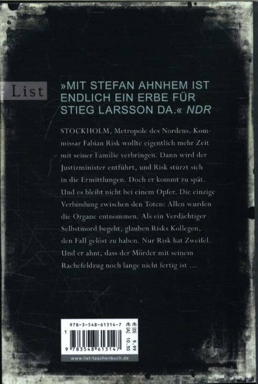 Stockholm, Metropole des Nordens. Fabian Risk wollte eigentlich mehr Zeit mit seiner Familie verbringen. Doch dann taucht die brutal zugerichtete Leiche des Justizministers auf, und Risk wird um Hilfe bei den Ermittlungen gebeten. Es bleibt nicht bei einem Opfer. Die einzige Verbindung zwischen den Toten: Jedem wurde ein Organ geraubt. Als ein Verdächtiger Selbstmord begeht, glauben Risks Kollegen, den Fall gelöst zu haben. Nur Risk hat Zweifel. Er hat eine Vermutung, was eigentlich hinter alldem steckt. Und er ahnt, dass der Mörder mit seinem Rachefeldzug noch lange nicht fertig ist ...