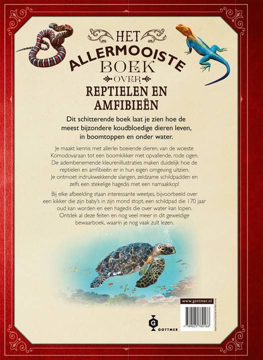 'Het allermooiste boek over reptielen en amfibieën' is het perfecte boek voor alle jonge biologen in de dop. Dit enorme boek biedt een meeslepende kennismaking met de fascinerende wereld van koudbloedige dieren. Ontdek een schitterend geïllustreerde verzameling van diverse reptielen en amfibieën, variërend van imposante koningscobra's tot kleurrijke gifgroene boomkikkers en zeldzame Galapagosschildpadden tot slimme Parsons kameleons.