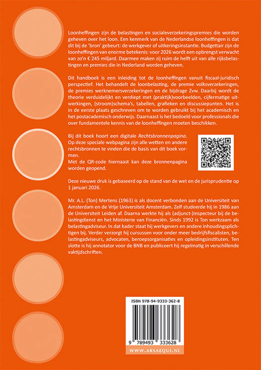 Loonheffingen zijn de belastingen en socialeverzekeringspremies die worden geheven over het loon. Een kenmerk van de Nederlandse loonheffingen is dat dit bij de ‘bron’ gebeurt: de werkgever of uitkeringsinstantie. Budgettair zijn de loonheffingen van enorme betekenis: voor 2026 wordt een opbrengst verwacht van zo’n € 245 miljard. Daarmee maken zij ruim de helft uit van alle rijksbelastingen en premies die in Nederland worden geheven. Dit handboek is een inleiding tot de loonheffingen vanuit fiscaal-juridisch perspectief. Het behandelt de loonbelasting, de premie volksverzekeringen, de premies werknemersverzekeringen en de bijdrage Zvw. Daarbij wordt de theorie verduidelijkt en verdiept met (praktijk)voorbeelden, cijfermatige uitwerkingen, (stroom)schema’s, tabellen, grafieken en discussiepunten. Het is in de eerste plaats geschreven om te worden gebruikt bij het academisch en het postacademisch onderwijs. Daarnaast is het bedoeld voor professionals die over fundamentele kennis van de loonheffingen moeten beschikken. Bij dit boek hoort een digitale Rechtsbronnenpagina. Op deze speciale webpagina zijn alle wetten en andere rechtsbronnen te vinden die de basis van dit boek vormen. Met de QR-code hiernaast kan deze bronnenpagina worden geopend. Deze nieuwe druk is gebaseerd op de stand van de wet en de jurisprudentie op 1 januari 2026. Mr. A.L. (Ton) Mertens (1963) is als docent verbonden aan de Universiteit van Amsterdam en de Vrije Universiteit Amsterdam. Zelf studeerde hij in 1986 aan de Universiteit Leiden af. Daarna werkte hij als (adjunct-)inspecteur bij de belastingdienst en het Ministerie van Financiën. Sinds 1992 is Ton werkzaam als belastingadviseur. In dat kader staat hij werkgevers en andere inhoudingsplichtigen bij. Verder verzorgt hij cursussen voor onder meer bedrijfsfiscalisten, belastingadviseurs, advocaten, beroepsorganisaties en opleidingsinstituten. Ten slotte is hij annotator voor de BNB en publiceert hij regelmatig in verschillende vaktijdschriften.