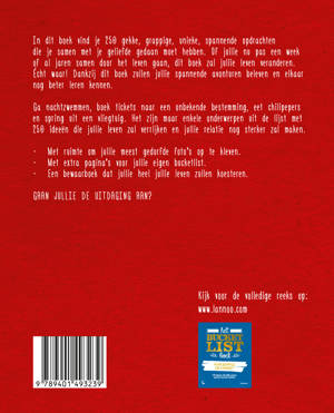In dit boek vind je 250 gekke, grappige, unieke, spannende opdrachten die je samen met je geliefde gedaan moet hebben. Of jullie nu pas een week of al jaren samen door het leven gaan, dit boek zal jullie leven veranderen.