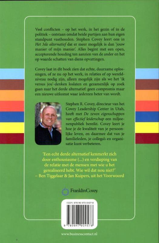 Veel conflicten op het werk, in het gezin of in de politiek slepen zich voort omdat beide partijen aan hun eigen standpunt vasthouden. Elke partij wil de andere niet echt serieus nemen en vreest zichzelf te verliezen als hij toegeeft. Stephen Covey leert ons in Het 3de alternatief dat er meer mogelijk is dan jouw manier of mijn manier. Hij bouwt daarbij voort op het in De zeven eigenschappen geïntroduceerde concept van synergie. Als synergie serieus wordt nagestreefd en Covey geeft in dit boek talloze voorbeelden van hoe dat kan, op kleine en grote schaal zijn er grote en grootse doorbraken mogelijk. Alles begint met een open, accepterende houding ten aanzien van de ander en het op waarde schatten van diens opvattingen. Covey laat in dit boek zien dat echte, duurzame oplossingen,of ze nu op het werk, in relaties of op wereldniveau nodig zijn, alleen mogelijk zijn als we het ik versus jou-denken loslaten en gezamenlijk op zoek gaan naar het derde alternatief: geen compromis maar een nieuwe uitkomst waar iedereen beter van wordt.