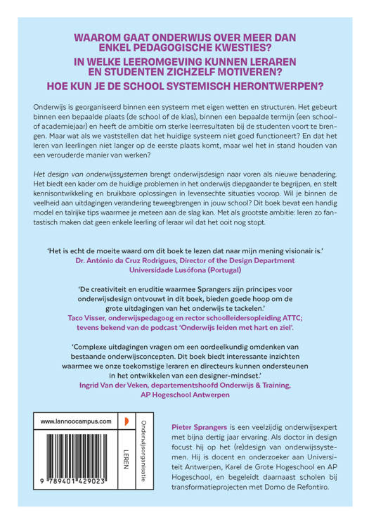 'Het is echt de moeite waard om dit boek te lezen dat naar mijn mening visionair is.' - Dr. António da Cruz Rodrigues, Director of the Design Department Universidade Lusófona (Portugal) 'De creativiteit en eruditie waarmee Sprangers zijn principes voor onderwijsdesign ontvouwt in dit boek, bieden goede hoop om de grote uitdagingen van het onderwijs te tackelen.' - Taco Visser, onderwijspedagoog en rector schoolleidersopleiding ATTC; tevens bekend van de podcast 'Onderwijs leiden met hart en ziel'. 'Complexe uitdagingen vragen om een oordeelkundig omdenken van bestaande onderwijsconcepten. Dit boek biedt interessante inzichten waarmee we onze toekomstige leraren en directeurs kunnen ondersteunen in het ontwikkelen van een designer-mindset.' Ingrid Van der Veken, departementshoofd Onderwijs & Training, AP Hogeschool Antwerpen