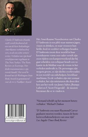 Het Amerikaanse Noordwesten van Charles DAmbrosio is een plek waar mannen jagen, vissen en drinken, en waar vrouwen hun liefde, leed en verdriet verborgen houden. DAmbrosio toont deze wereld in haar kwetsbaarste vorm: een vader vertelt zijn zoon tijdens een kampeerweekend dat hij gaat scheiden; een echtpaar houdt een vakantie in de blokhut waar de vrouw in het verleden misbruikt is. De personages zijn nergens groots; ze zijn slechts overlevenden in een wereld van onbeholpen, breekbaar machismo. En de verhalen zijn niet zomaar verhalen, het zijn miniaturen die doen denken aan het werk van James Salter, Jhumpa Lahiri en F. Scott Fitzgerald de mooiste literatuur die er te vinden is.