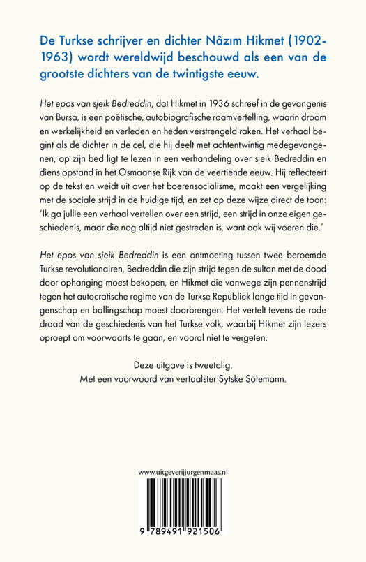 De Turkse schrijver en dichter Nâzım Hikmet (1902-1963) wordt wereldwijd beschouwd als een van de grootste dichters van de twintigste eeuw. Nog altijd geldt hij als de belangrijkste avant-gardist in de poëzie van zijn vaderland. 'Het epos van sjeik Bedreddin', dat Hikmet in 1936 schreef in de gevangenis van Bursa, is een poëtische, autobiografische raamvertelling, waarin droom en werkelijkheid en verleden en heden verstrengeld raken. Het verhaal begint als de dichter in de cel, die hij deelt met achtentwintig medegevangenen, op zijn bed ligt te lezen in een verhandeling over sjeik Bedreddin en diens opstand in het Osmaanse Rijk van de veertiende eeuw. Hij reflecteert op de tekst en weidt uit over het boerensocialisme, maakt een vergelijking met de sociale strijd in de huidige tijd, en zet op deze wijze direct de toon: 'Ik ga jullie een verhaal vertellen over een strijd, een strijd in onze eigen geschiedenis, maar die nog altijd niet gestreden is, want ook wij voeren die.'
