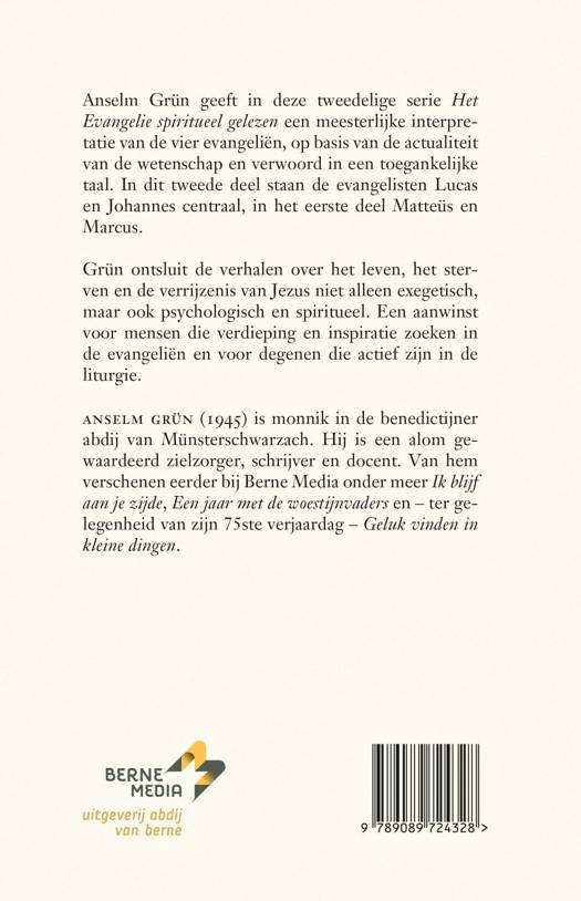 De bekende monnik Anselm Grün geeft in deze tweedelige serie een meesterlijke interpretatie van de vier evangeliën, op basis van de actualiteit van de wetenschap, verwoord in een taal die iedereen begrijpt. In dit tweede deel staan de evangelisten Lucas en Johannes centraal. Grün ontsluit de verhalen over het leven, het sterven en het verrijzen van Jezus niet alleen exegetisch maar ook psychologisch en spiritueel. Een aanwinst voor mensen die verdieping en inspiratie zoeken in de verschillende evangeliën en voor hen die in kerken actief zijn.