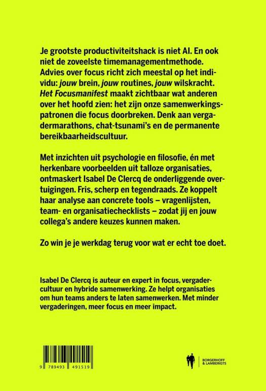 Je grootste productiviteitshack is niet AI. En ook niet de zoveelste timemanagementmethode. Advies over focus richt zich meestal op het individu: jouw brein, jouw routines, jouw wilskracht. Het Focusmanifest maakt zichtbaar wat anderen over het hoofd zien: het zijn onze samenwerkingspatronen die focus doorbreken. Denk aan vergadermarathons, chat-tsunami's en de permanente bereikbaarheidscultuur.