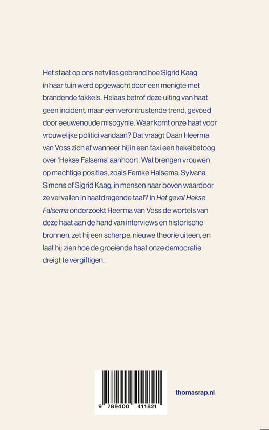 Het staat op ons netvlies gebrand hoe Sigrid Kaag werd opgewacht in haar tuin door een menigte met brandende fakkels. Helaas betrof deze uiting van haat geen incident, maar een verontrustende trend, gevoed door eeuwenoude misogynie. Waar komt onze haat voor vrouwelijke politici vandaan? Dat vraagt Daan Heerma van Voss zich af wanneer hij in een taxi een hekelbetoog over ‘Hekse Falsema’ aanhoort. Wat brengen vrouwen op machtige posities, zoals Femke Halsema, Sylvana Simons of Sigrid Kaag, in mensen naar boven waardoor ze vervallen in haatdragende taal? In Het geval Hekse Falsema onderzoekt Heerma van Voss de wortels van deze haat aan de hand van interviews en historische bronnen, zet hij een scherpe, nieuwe theorie uiteen, en laat hij zien hoe de groeiende haat onze democratie dreigt te vergiftigen.