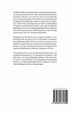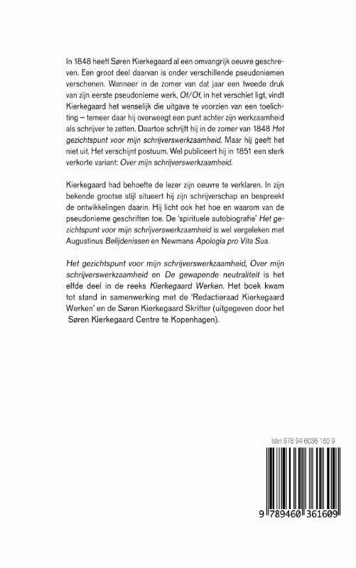 'Mijn schrijverswerkzaamheid' bestaande uit de vertaling van 'Het gezichtspunt voor mijn schrijverswerkzaamheid', 'Over mijn schrijverswerkzaamheid' en 'De gewapende neutraliteit' vormt het elfde deel in de reeks Kierkegaard Werken.