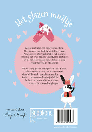 Het wordt een superspannende dag voor Millie, want ze gaat met haar lievelingstante naar een balletvoorstelling! Ze gaan naar Assepoester, Millie’s favoriete sprookje. Als kers op de taart heeft Millie ook nog eens prachtige glazen muiltjes gekregen! En de konijntjes? Die gaan natuurlijk mee naar het theater, wat denk je! Die zitten lekker knus in Millie’s jas. Maar dan loopt het mis. Opeens is Millie een glazen muiltje kwijt… Waar is het naartoe? Millie en de konijntjes moeten op onderzoek uit gaan. Het wordt een magisch avontuur…