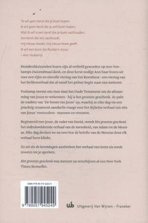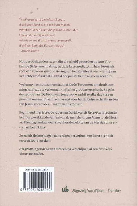 Voskamp neemt ons mee naar het Oude Testament om de afstamming van Jezus te verkennen - hij is het grootste geschenk. Ze pakt de traditie van 'De boom van Jesse' op, waarbij elke dag via een eigen prachtig ornament aandacht vraagt voor het Bijbelse verhaal van één van Jezus' voorouders - mannen en vrouwen.