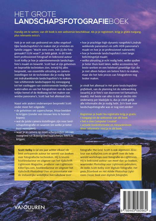 Heb je er ooit van gedroomd om zulke ongelooflijke landschapsfoto's te maken dat je vrienden en familie zeggen: 'Wacht eens even, heb jij die foto gemaakt?! Echt waar?'. Je hebt geluk. In dit boek leert professioneel fotograaf en bekroond auteur Scott Kelby je hoe je adembenemende landschapsfoto's maakt en bewerkt. Scott laat al zijn geheimen en beproefde technieken zien, terwijl hij alles bespreekt, van essentiële uitrusting en camera-instellingen tot de technieken die je nodig hebt om indrukwekkende landschapsfoto's te maken. Van schitterende landschappen bij zonsopgang tot het vastleggen van snelstromende beekjes en watervallen en van het fotograferen van de nachtelijke hemel of de Melkweg tot het maken van weidse panorama's, Scott laat het allemaal zien.