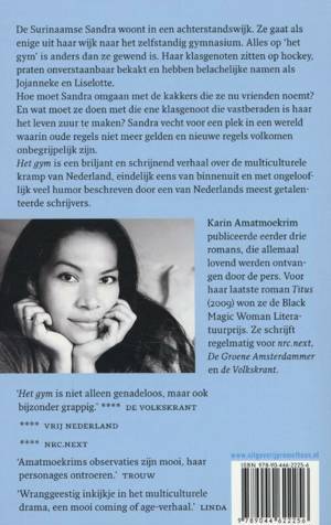 De Surinaamse Sandra woont in een achterstandswijk. Ze gaat als enige uit haar wijk naar het zelfstandig gymnasium. Alles op ‘het gym’ is anders dan ze gewend is. Haar klasgenoten zitten op hockey, praten onverstaanbaar bekakt en hebben belachelijke namen als Jojanneke en Liselotte.Hoe moet Sandra omgaan met de kakkers die ze nu vrienden noemt? En wat moet ze doen met die ene klasgenoot die vastberaden is haar het leven zuur te maken? Sandra vecht voor een plek in een wereld waarin oude regels niet meer gelden en nieuwe regels volkomen onbegrijpelijk zijn.Het gym is een briljant en schrijnend verhaal over de multiculturele kramp van Nederland, eindelijk eens van binnenuit en met ongelooflijk veel humor beschreven door een van Nederlands meest getalenteerde schrijvers.Karin Amatmoekrim publiceerde eerder drie romans, die allemaal lovend werden ontvangen door de pers. Voor haar laatste roman Titus (2009) won ze de Black Magic Woman Literatuurprijs. Ze schrijft regelmatig voor nrc.next, De Groene Amsterdammer en de Volkskrant.‘Amatmoekrim schrijft direct, precies en dwingend.’ Vrij Nederland‘Amatmoekrim blijft de nieuwsgierigheid prikkelen.’ de Volkskrant