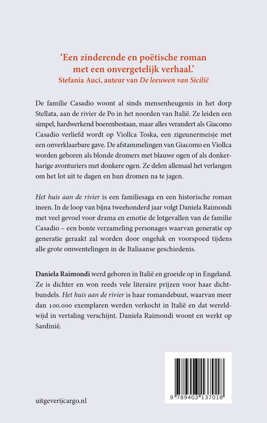 Het huis aan de rivier is een familiesaga en een historische roman ineen. In de loop van bijna tweehonderd jaar volgt Daniela Raimondi met veel gevoel voor drama en emotie de lotgevallen van de familie Casadio – een bonte verzameling personages waarvan generatie op generatie geraakt zal worden door ongeluk en voorspoed tijdens alle grote omwentelingen in de Italiaanse geschiedenis.