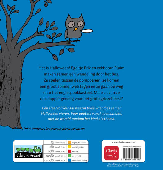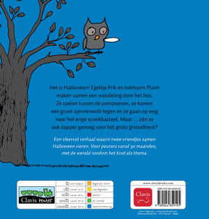 Het is Halloween! Egeltje Prik en eekhoorn Pluim maken samen een wandeling door het bos. Ze spelen tussen de pompoenen, ze komen een groot spinnenweb tegen en ze gaan op weg naar het enge spookkasteel. Maar … zijn ze ook dapper genoeg voor het grote griezelfeest?