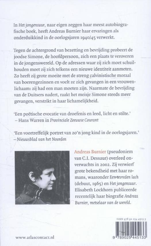 Het jongensuur, naar eigen zeggen haar meest autobiografische boek, heeft Andreas Burnier haar ervaringen als onderduikkind in de oorlogsjaren 1940/45 verwerkt. Tegen de achtergrond van bezetting en bevrijding probeert de joodse Simone, de hoofdpersoon, zich een plaats te veroveren in de jongenswereld. Op de adressen waar zij zich moet schuilhouden moet zij zich telkens een nieuwe identiteit aanmeten. Zo heeft zij grote moeite met de streng calvinistische moraal van boerengezinnen en voelt ze zich gevangen in een vrouwenlichaam: zij had een man moeten zijn. Naarmate de bevrijding van de Duitsers nadert, raakt het meisje Simone steeds meer gevangen, verstrikt in haar lichamelijkheid.
