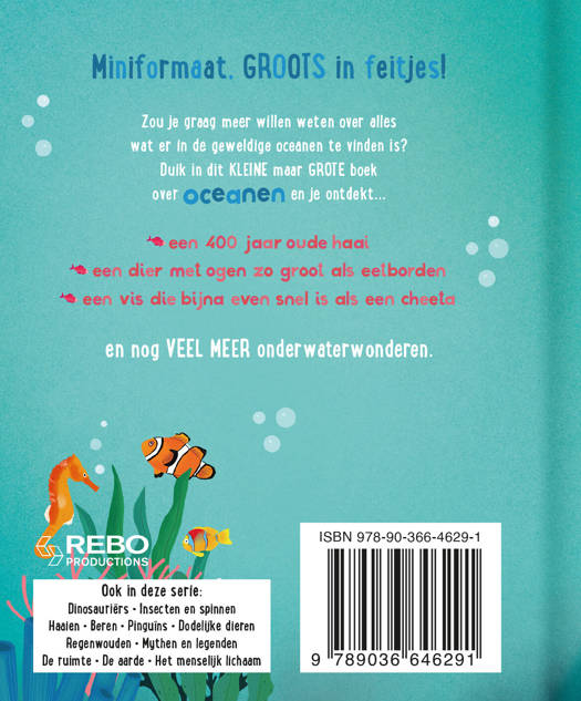 Zou je graag meer willen weten over alles wat er in de geweldige oceanen te vinden is? Duik in dit kleine maar grote boek over oceanen en je ontdekt een 400 jaar oude haai, een dier met ogen zo groot als eetborden, een vis die bijna even snel is als een cheeta en nog veel meer onderwaterwonderen.