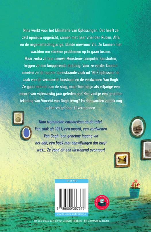 Nu het Ministerie van Oplossingen opnieuw is opgericht, kan Nina niet wachten om aan de slag te gaan samen met Alfa, Ruben en mevrouw Vis. Het Internationaal Genootschap stuurt een bericht dat ze kunnen beginnen zodra de laatste openstaande zaak is opgelost. Een onopgeloste zaak? De kinderen duiken samen met mevrouw Vis in de archieven en ontdekken dat er inderdaad een zaak is uit 1953 waar het Ministerie nooit een oplossing voor heeft gevonden: de zaak van de vermoorde huisbaas en de verdwenen Van Gogh.