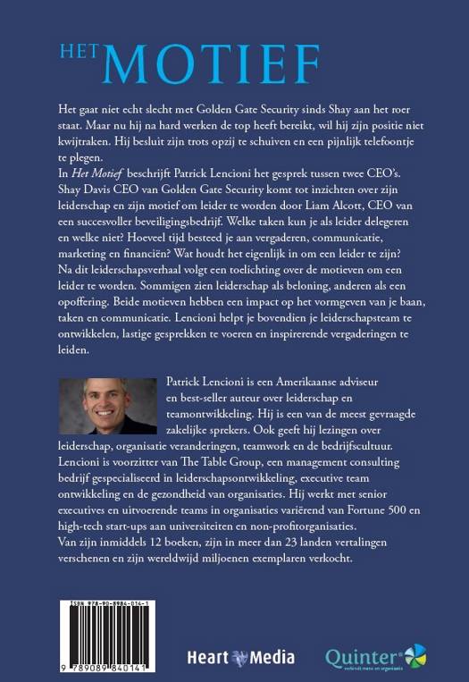 Het gaat niet echt slecht met Golden Gate Security sinds Shay aan het roer staat. Maar nu hij na hard werken de top heeft bereikt, wil hij zijn positie niet kwijtraken. Hij besluit zijn trots opzij te schuiven en een pijnlijk telefoontje te plegen. In Het Motief beschrijft Patrick Lencioni het gesprek tussen twee CEO's. Shay Davis CEO van Golden Gate Security komt tot inzichten over zijn leiderschap en zijn motief om leider te worden door Liam Alcott, CEO van een succesvoller beveiligingsbedrijf. Welke taken kun je als leider delegeren en welke niet? Hoeveel tijd besteed je aan vergaderen, communicatie, marketing en financiën? Wat houdt het eigenlijk in om een leider te zijn? Na dit leiderschapsverhaal volgt een toelichting over de motieven om een leider te worden. Sommigen zien leiderschap als beloning, anderen als een opoffering. Beide motieven hebben een impact op het vormgeven van je baan, taken en communicatie. Lencioni helpt je bovendien je leiderschapsteam te ontwikkelen, lastige gesprekken te voeren en inspirerende vergaderingen te leiden.