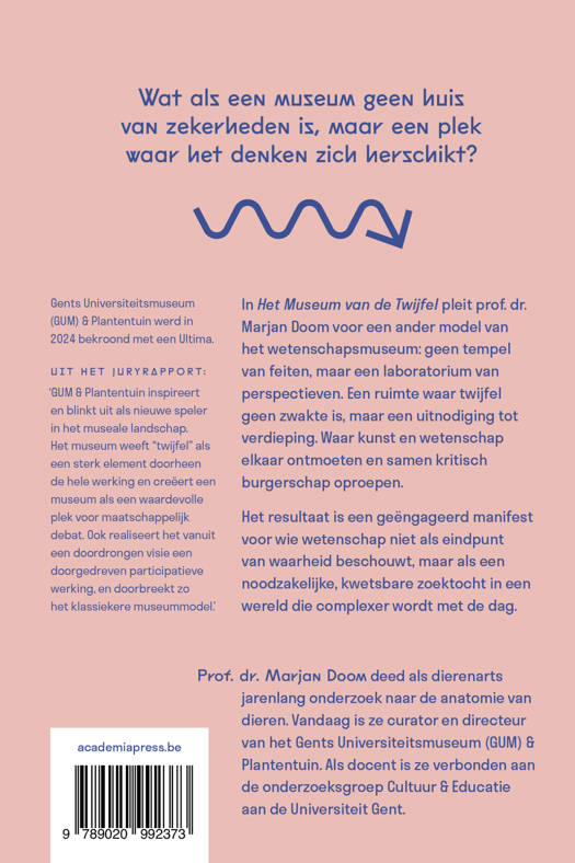 In Het Museum van de Twijfel pleit prof. dr. Marjan Doom voor een ander model van het wetenschapsmuseum: geen tempel van feiten, maar een laboratorium van perspectieven. Een ruimte waar twijfel geen zwakte is, maar een uitnodiging tot verdieping. Waar kunst en wetenschap elkaar ontmoeten en samen kritisch burgerschap oproepen. Het resultaat is een geëngageerd manifest voor wie wetenschap niet als eindpunt van waarheid beschouwt, maar als een noodzakelijke, kwetsbare zoektocht in een wereld die complexer wordt met de dag.