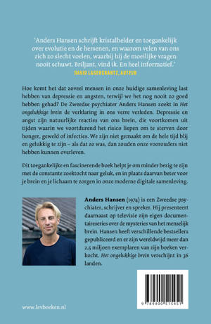 Hoe komt het dat zoveel mensen in onze moderne samenleving last hebben van depressie en angsten, terwijl we het nog nooit zo goed hebben gehad? De Zweedse psychiater Anders Hansen zoekt in Het ongelukkige brein de verklaring in ons verre verleden. Depressie en angst zijn natuurlijke reacties van ons brein, die voortkomen uit vroegere tijden waarin we voortdurend het risico liepen om te sterven door honger, geweld of infecties. We zijn niet gemaakt om de hele tijd blij en gelukkig te zijn – als dat zo was, dan zouden onze voorouders het niet hebben overleefd. Dit toegankelijke en fascinerende boek helpt je om minder bezig te zijn met de constante zoektocht naar geluk, en in plaats daarvan beter voor je brein en je lichaam te zorgen in onze huidige digitale samenleving.