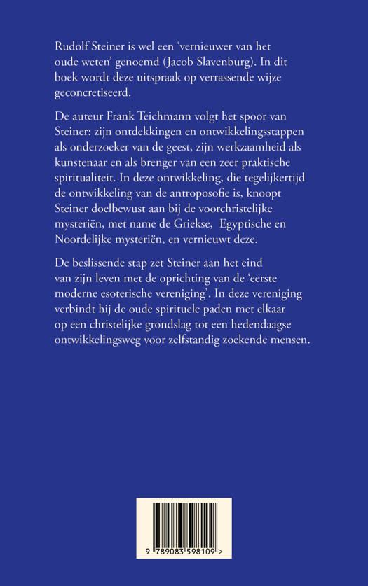 Rudolf Steiner is wel een ‘vernieuwer van het oude weten’ genoemd (Jacob Slavenburg). In dit boek wordt deze uitspraak op verrassende wijze geconcretiseerd. De auteur Frank Teichmann volgt het spoor van Steiner: zijn ontdekkingen en ontwikkelingsstappen als onderzoeker van de geest, zijn werkzaamheid als kunstenaar en als brenger van een zeer praktische spiritualiteit. In deze ontwikkeling, die tegelijkertijd de ontwikkeling van de antroposofie is, knoopt Steiner doelbewust aan bij de voorchristelijke mysteriën, met name de Griekse, Egyptische en Noordelijke mysteriën, en vernieuwt deze. De beslissende stap zet Steiner aan het eind van zijn leven met de oprichting van de ‘eerste moderne esoterische vereniging’. In deze vereniging verbindt hij de oude spirituele paden met elkaar op een christelijke grondslag tot een hedendaagse ontwikkelingsweg voor zelfstandig zoekende mensen.