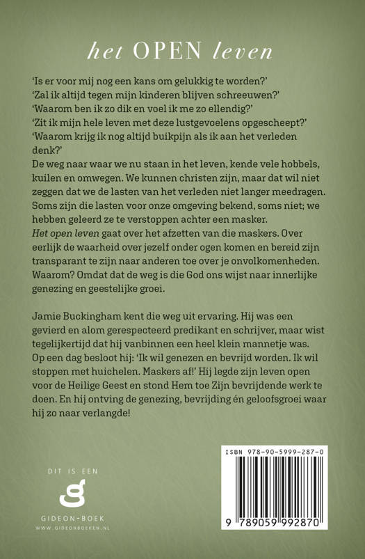 Het open leven gaat over het afzetten van die maskers. Over eerlijk de waarheid over jezelf onder ogen komen en bereid zijn transparant te zijn naar anderen toe over je onvolkomenheden. Waarom? Omdat dat de weg is die God ons wijst naar innerlijke genezing en geestelijke groei.