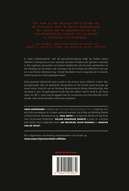 In deze baanbrekende 'wat als'-geschiedschrijving krijgt de Duitse keizer Wilhelm II alsnog het proces waaraan hij bijna honderd jaar geleden ontsnapt is. Een topteam van juristen en historici distilleerde vijf concrete aanklachten uit het Verdrag van Versailles, dat voorzag in de berechting van Wilhelm II voor zijn rol in de Eerste Wereldoorlog. Omdat Nederland hem weigerde uit te leveren, heeft het proces nooit plaatsgevonden. Deze gemiste historische kans wordt in Het proces tegen Wilhelm II meer dan goedgemaakt. Aan de aanklacht, het pleidooi en het vonnis werd acht jaar gewerkt onder toezicht van de Stichting Studiecentrum Eerste Wereldoorlog. Het resultaat is een hoogstorigineel boek dat niet alleen inzicht biedt in de dynamiek van WO I, maar ook teruggaat naar de oorsprong van internationale rechtspraak. Het vonnis zal zeker stof doen opwaaien.