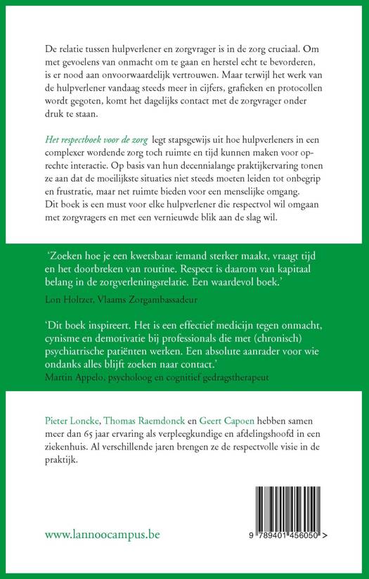 Het respectboek voor de zorg legt stapsgewijs uit hoe hulpverleners in een complexer wordende zorg toch ruimte en tijd kunnen maken voor oprechte interactie. Op basis van hun decennialange praktijkervaring tonen ze aan dat de moeilijkste situaties niet steeds moeten leiden tot onbegrip en frustratie, maar net ruimte bieden voor een menselijke omgang. Dit boek is een must voor elke hulpverlener die respectvol wil omgaan met zorgvragers en met een vernieuwde blik aan de slag wil.