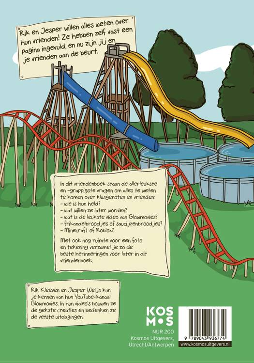 Dit is hét vriendenboek van Rik en Jesper, bekend van hun YouTube-kanaal Glowmovies waar ze de gekste creaties bouwen. In dit vriendenboek staan de allerleukste, -gekste en -grappigste vragen om alles te weten te komen over klasgenoten en vrienden: