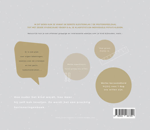 In dit boek kun je vanaf de eerste kleuterklas/de peuterspeelzaal tot het zesde studiejaar/groep 8 al je klasfoto's en individuele foto's kleven.