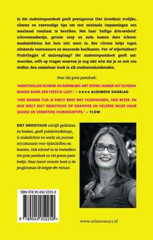 In Het studentenpoetsboek geeft poetsgoeroe Diet Groothuis vrolijke, slimme en eenvoudige tips om met minimale inspanningen een maximaal resultaat te bereiken. Met haar ‘heilige drie-eenheid’ schoonmaakazijn, groene zeep en soda komen dure schoonmaakmiddelen het huis niet meer in. Een citroen helpt tegen stinkende vaatwassers en koelkasten. Vet- of wijnvlekken? Fruitvliegjes of muizenplaag? Het studentenpoetsboek geeft antwoorden, zelfs op vragen waarvan je nog niet wist dat je ze ooit zou stellen. Een onmisbaar boek in elk
