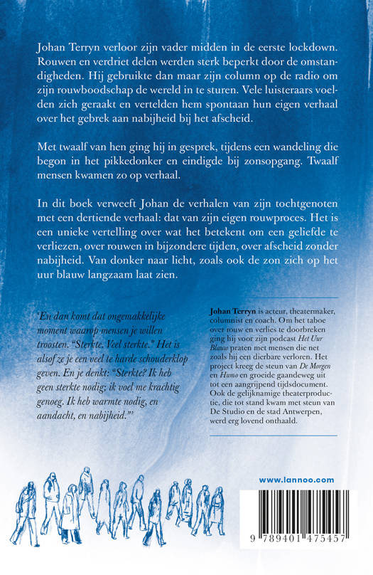 Johan Terryn verloor zijn vader midden in de eerste lockdown. Rouwen en verdriet delen werden sterk beperkt door de omstandigheden. Hij gebruikte dan maar zijn column op de radio om zijn rouwboodschap de wereld in te sturen. Vele luisteraars voelden zich geraakt en vertelden hem spontaan hun eigen verhaal over het gebrek aan nabijheid bij het afscheid. Met twaalf van hen ging hij in gesprek, tijdens een wandeling die begon in het pikkedonker en eindigde bij zonsopgang. Twaalf mensen kwamen zo op verhaal. In dit boek verweeft Johan de verhalen van zijn tochtgenoten met een dertiende verhaal: dat van zijn eigen rouwproces. Het is een unieke vertelling over wat het betekent om een geliefde te verliezen, over rouwen in bijzondere tijden, over afscheid zonder nabijheid. Van donker naar licht, zoals ook de zon zich op het uur blauw langzaam laat zien. 'En dan komt dat ongemakkelijke moment waarop mensen je willen troosten. "Sterkte. Veel sterkte." Het is alsof ze je een veel te harde schouderklop geven. En je denkt: 'Sterkte? Ik heb geen sterkte nodig; ik voel me krachtig genoeg. Ik heb warmte nodig, en aandacht, en nabijheid."'