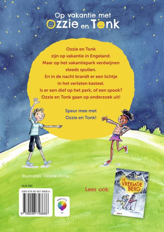 Op vakantie met Ozzie en Tonk is een spannende speurdersserie voor kinderen van 7 tot 9 jaar. In elk boek gaan de vrienden Ozzie en Tonk op vakantie, steeds in een ander land. Daar ontdekken ze iets verdachts dat tot op de bodem uitgezocht moet worden! In dit eerste boek gaan de vrienden Ozzie en Tonk op vakantie naar Engeland. Maar op het vakantiepark verdwijnen steeds spullen en ™s avonds brandt er een lichtje in het verlaten kasteel. Is er een dief op het park of een spook? Ozzie en Tonk gaan in het donker op onderzoek uit. Heerlijk speurdersboek op AVI M5.