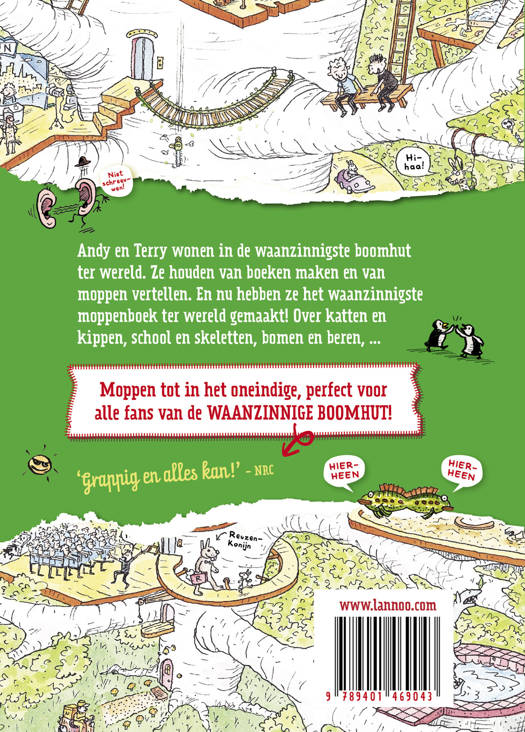 Andy en Terry wonen in de waanzinnigste boomhut ter wereld. Ze houden van boeken maken en van moppen vertellen. En nu hebben ze het waanzinnigste moppenboek ter wereld gemaakt! Over katten en kippen, school en skeletten, bomen en beren, ...