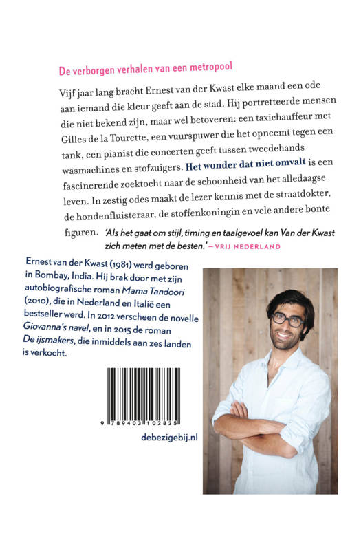 Al vijf jaar brengt Ernest van der Kwast odes aan mensen die kleur geven aan de stad. Van de glazenwasser van het grootste gebouw van Nederland, die drie maanden ouder is wanneer het laatste raam gelapt is en dan weer opnieuw begint, tot een paaldanseres in een nachtclub, die tijdens haar act naar de auteur kijkt zoals geen enkele vrouw ooit naar hem heeft gekeken. Ernest van der Kwast heeft oog voor de schoonheid van alledaagse levens en maakt van hun verhalen literatuur. Hij laat de lezer kennismaken met mensen die niet bekend zijn, maar wel betoveren: een taxichauffeur met het syndroom van Gilles de la Tourette, een vuurspuwer die het opneemt tegen een tank, een pianist die concerten geeft te midden van tweedehands wasmachines en stofzuigers.