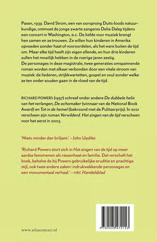 In 'Het zingen van de tijd' van Richard Powers ontmoet David Strom, een van oorsprong Duits-Joods natuurkundige, rond Pasen 1939 de jonge zwarte zangeres Delia Daley tijdens een concert in Washington, D.C. De liefde voor muziek brengt hen samen en ze trouwen. Ze willen hun kinderen in Amerika opvoeden zonder haat of vooroordelen, als het ware buiten de tijd om. Maar elke tijd heeft zijn eigen ellende, en hun drie kinderen zullen het moeilijk hebben in de roerige jaren zestig. De personages in deze magistrale, twee generaties omspannende roman worden met elkaar verbonden door een vitale stroom van muziek: de liederen, strijkkwartetten, gospel en soul zonder welke ze ten onder zouden gaan in de vloed van de tijd.