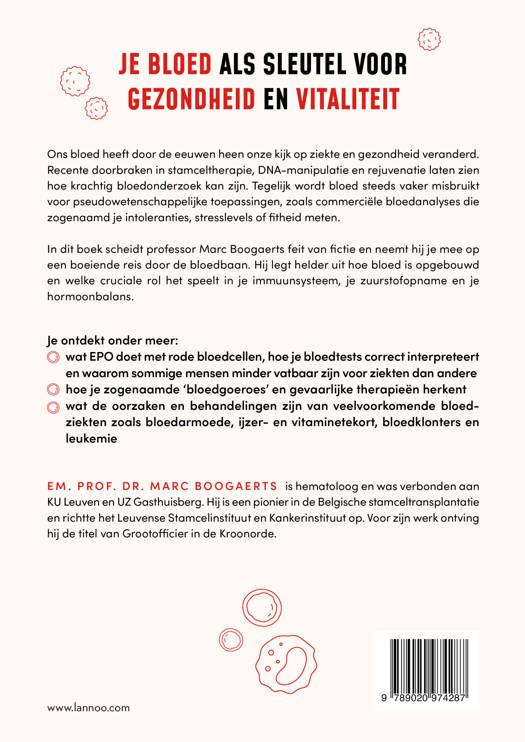 Ons bloed heeft door de eeuwen heen onze kijk op ziekte en gezondheid veranderd. Recente doorbraken in stamceltherapie, DNA-manipulatie en rejuvenatie laten zien hoe krachtig bloedonderzoek kan zijn. Tegelijk wordt bloed steeds vaker misbruikt voor pseudowetenschappelijke toepassingen, zoals commerciële bloedanalyses die zogenaamd je intoleranties, stresslevels of fitheid meten. In dit boek scheidt professor Marc Boogaerts feit van fictie en neemt hij je mee op een boeiende reis door de bloedbaan. Hij legt helder uit hoe bloed is opgebouwd en welke cruciale rol het speelt in je immuunsysteem, je zuurstofopname en je hormoonbalans. Je ontdekt onder meer: