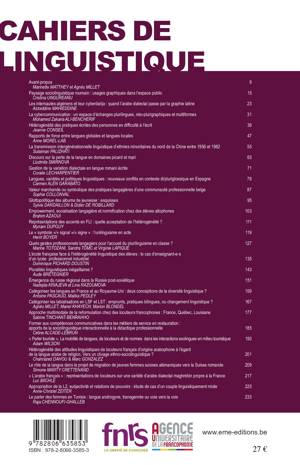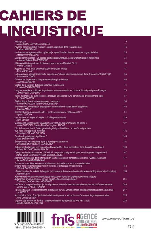 Les Cahiers de Linguistique, qui poursuivent le travail éditorial entrepris depuis 1972 par les Cahiers de l'Institut de Linguistique de Louvain, sont désormais plus spécifiquement consacrés à l'étude des rapports entre une langue dans sa variation - le français - et la société ou, plutôt, les sociétés où elle est employée, dans des contextes toujours plurilingues.