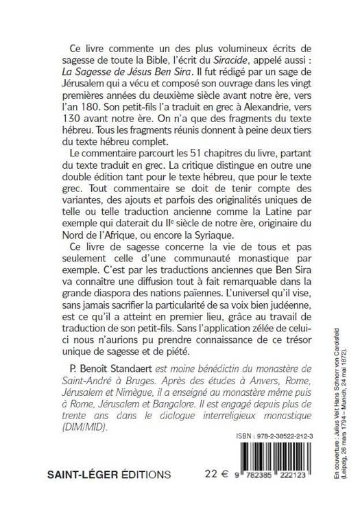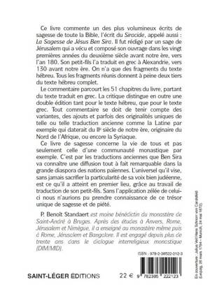 Le commentaire parcourt les 51 chapitres du livre, partant du texte traduit en grec par le petit fils de Ben Sira, vers l’an 130 avant notre ère. L’original hébreu n’existe qu’en des fragments, retrouvés en plusieurs endroits différents (au Caire, à Qumrân et à Masada, au sud de la Mer morte) et provenant d’époques très variées. Tous les fragments réunis donnent à peine deux tiers du texte complet. La critique distingue en outre une double édition pour le texte hébreu, et il en est de même pour le texte grec où une version ancienne fut suivie d’une deuxième version enrichie. Tout commentaire se doit de tenir compte des variantes, des ajouts et parfois des originalités uniques de telle ou telle traduction ancienne comme la Latine par exemple ou la Syriaque. Le souci du commentateur est de dégager les unités thématiques des proverbes réunis dans chaque chapitre, et l’originalité synthétique du sage de Jérusalem qui cherche à éduquer surtout des jeunes contemporains.