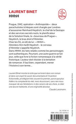 Prague, 1942, opération « Anthropoïde » deux parachutistes tchèques sont chargés par Londres d'assassiner Reinhard Heydrich, le chef de la Gestapo et des services secrets nazis, le planificateur de la Solution finale, le « bourreau de Prague ». Heydrich, le bras droit d'Himmler. Chez les SS, on dit de lui: « HHhH ». Himmlers Hirn heiβt Heydrich - le cerveau d'Himmler s'appelle Heydrich. Dans ce livre, les faits relatés comme les personnages sont authentiques. Pourtant, une autre guerre se fait jour, celle que livre la fiction romanesque à la vérité historique. L'auteur doit résister à la tentation de romancer. Il faut bien, cependant, mener l'histoire à son terme...