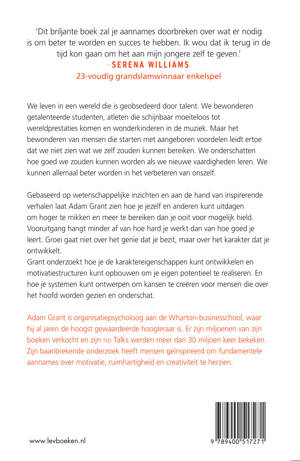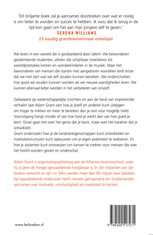 Gebaseerd op wetenschappelijke inzichten en aan de hand van inspirerende verhalen laat Adam Grant zien hoe je jezelf en anderen kunt uitdagen om hoger te mikken en meer te bereiken dan je ooit voor mogelijk had gehouden. Vooruitgang hangt minder af van hoe hard je werkt dan van hoe goed je leert. Groei gaat niet over het genie dat je bezit - het gaat over het karakter dat je ontwikkelt.