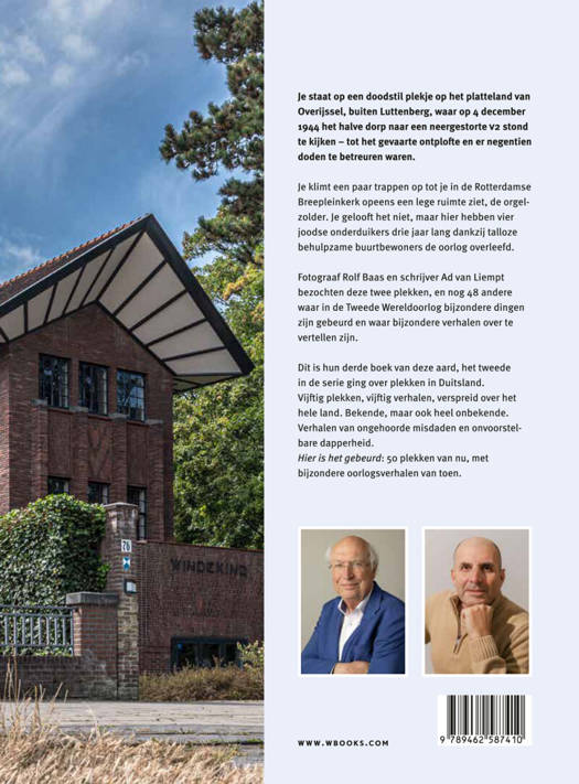Zomaar drie plekken in Nederland waar tijdens de Tweede Wereldoorlog iets onvoorstelbaars gebeurde. Er zijn veel meer van die plekken. Vijftig daarvan staan in het boek Hier is het gebeurd, gefotografeerd door Rolf Baas en beschreven door Ad van Liempt. Dit is hun derde gezamenlijke productie van deze aard. Vijftig plekken, vijftig verhalen, verspreid over het hele land. Bekende, maar ook heel onbekende. Verhalen van ongehoorde misdaden en onbegrijpelijke dapperheid.