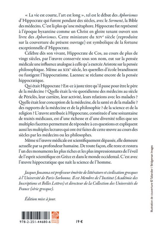 La vie est courte, l'art est long , tel est le debut des Aphorismes d'Hippocrate qui furent pendant des siecles, avec le Serment, la Bible des medecins. C'est la plus qu'une metaphore. Hippocrate fut represente a l'epoque byzantine comme un Christ en gloire tenant ouvert son livre des Aphorismes. Cette miniature du xive siecle (reproduite sur la couverture du present ouvrage) est symbolique de la fortune exceptionnelle d'Hippocrate. Celebre des son vivant, Hippocrate de Cos, au cours de plus de vingt siecles, par l'oeuvre conservee sous son nom, eut sur la pensee medicale une influence analogue a celle qu'a exercee Aristote sur la pensee philosophique. Meme au xixe siecle, les querelles d'ecole brandissent ou fustigent l'hippocratisme. Laennec se reclame encore de la pensee hippocratique. Qui etait Hippocrate ? Est-ce a juste titre qu'il passe pour etre le pere de la medecine ? Quelle etait la vie quotidienne des medecins au siecle de Pericles, leur carriere, leur activite, leurs relations avec les malades ? Quelle etait leur conception de la medecine, de la sante et de la maladie ? des rapports de la medecine et de la philosophie ? de la science et de la religion ? L'oeuvre attribuee a Hippocrate, constituee d'une soixantaine de traites medicaux, est d'une richesse et d'une diversite telles que ses multiples facettes permettent de repondre a ces questions et expliquent aussi les multiples lectures qui ont ete faites de cette oeuvre au cours des siecles par les medecins ou les philosophes. Meme si l'oeuvre medicale est scientifiquement depassee, elle demeure actuelle par sa profondeur humaine. De toute facon, elle reste et restera l'un des monuments les plus riches et les plus impressionnants de l'eveil de l'esprit scientifique en Grece et dans le monde occidental. C'est avec l'oeuvre hippocratique que nait la science de l'homme. Edition mise a jour.