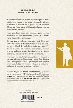 Ce texte écoféministe, jamais republié depuis le XVIIe siècle, nous plonge en un temps où écrire les sciences naturelles au féminin ne va pas de soi, et où (après Descartes) l’idée même d’affect animal passe pour de la sensiblerie ridicule. Trois chercheurs nous introduisent, à partir de leur discipline, aux enjeux complexes suscités par la découverte du caméléon en Europe. Ils rouvrent le dialogue souterrain, mais bien réel, entre Madeleine de Scudéry, la romancière des sentiments, et Claude Perrault, l’anatomiste de Louis XIV. Et ils montrent sa fécondité surprenante, puisque « le cas Méléon » permet d’éclairer les débats actuels autour du féminisme et du droit des animaux. Une source oubliée de l’éthologie moderne, où s’invente la poétique des biographies animales, et où l’on découvre que l’esthétique galante de l’âge classique rend lisibles les sentiments des bêtes, au moment même où ils sont invisibilisés par le nouveau paradigme cartésien. Edition dirigée par Aude VOLPILHAC, spécialiste de la littérature du XVIIe siècle, avec la collaboration de Anthony HERREL, du Muséum national d'histoire naturelle à Paris, et de Thierry HOQUET, spécialiste de philosophie des sciences naturelles.