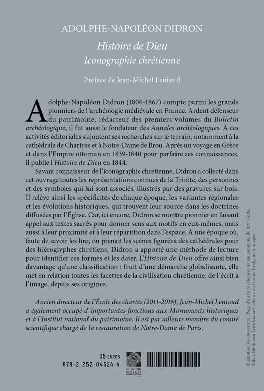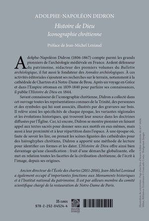 Adolphe-Napoleon Didron (1806-1867) compte parmi les grands pionniers de l'archeologie medievale en France. Ardent defenseur du patrimoine, redacteur des premiers volumes du Bulletin archeologique, il fut aussi le fondateur des Annales archeologiques. A ces activites editoriales s'ajoutent ses recherches sur le terrain, notamment a la cathedrale de Chartres et a Notre-Dame de Brou. Apres un voyage en Grece et dans l'Empire ottoman en 1839-1840 pour parfaire ses connaissances, il publie l'Histoire de Dieu en 1844. Savant connaisseur de l'iconographie chretienne, Didron a collecte dans cet ouvrage toutes les representations connues de la Trinite, des personnes et des symboles qui lui sont associes, illustres par des gravures sur bois. Il releve ainsi les specificites de chaque epoque, les variantes regionales et les evolutions historiques, qui trouvent leur source dans les doctrines diffusees par l'Eglise. Car, ici encore, Didron se montre pionnier en faisant appel aux textes sacres pour donner sens aux motifs en eux-memes, mais aussi a leur proximite et a leur repartition dans l'espace. A une epoque ou, faute de savoir les lire, on prenait les scenes figurees des cathedrales pour des hieroglyphes chretiens, Didron a apporte une methode de lecture pour identifier ces formes et les dater. L'Histoire de Dieu offre ainsi bien davantage qu'une classification: fruit d'une demarche globalisante, elle met en relation toutes les facettes de la civilisation chretienne, de l'ecrit a l'image, depuis ses origines.