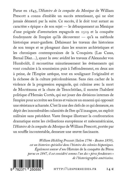 Parue en 1843, l’Histoire de la conquête du Mexique de William Prescott a connu d’emblée un succès retentissant, qui ne s’est jamais démenti par la suite. Ce succès, il le doit tout autant à son sujet — le débarquement au Mexique d’une poignée d’aventuriers espagnols en 1519 et la conquête foudroyante de l’empire qu’ils découvrent — qu’à sa méthode historique avant-gardiste pour l'époque. Délaissant les travaux des historiens de son temps et se plongeant dans les sources archivistiques et les chroniques contemporaines de la Conquista (Las Casas, Bernal Díaz…), ayant lu avec avidité les travaux d’Alexander von Humboldt, il reconstitue minutieusement les événements qui vont conduire à la soumission puis à l’effondrement, en deux ans à peine, de l’Empire aztèque, tout en soulignant l’originalité et la richesse de la culture précolombienne.