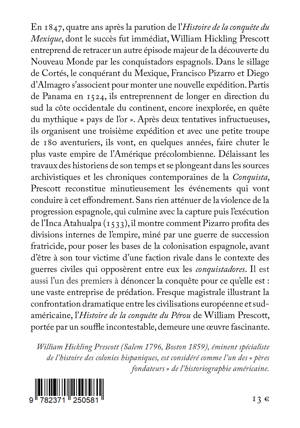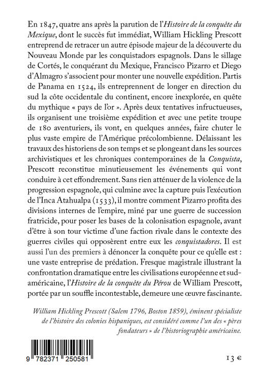 En 1847, quatre ans après la parution de l’Histoire de la conquête du Mexique, dont le succès fut immédiat, William Hickling Prescott entreprend de retracer un autre épisode majeur de la découverte du Nouveau Monde par les conquistadors espagnols. Dans le sillage de Cortés, le conquérant du Mexique, Francisco Pizarro et Diego d’Almagro s’associent pour monter une nouvelle expédition. Partis de Panama en 1524, ils entreprennent de longer en direction du sud la côte occidentale du continent, encore inexplorée, en quête du mythique « pays de l’or ». Après deux tentatives infructueuses, ils organisent une troisième expédition et avec une petite troupe de 180 aventuriers, ils vont, en quelques années, faire chuter le plus vaste empire de l’Amérique précolombienne. Délaissant les travaux des historiens de son temps et se plongeant dans les sources archivistiques et les chroniques contemporaines de la Conquista, Prescott reconstitue minutieusement les événements qui vont conduire à cet effondrement. Sans rien atténuer de la violence de la progression espagnole, qui culmine avec la capture puis l’exécution de l’Inca Atahualpa (1533), il montre comment Pizarro profita des divisions internes de l’empire, miné par une guerre de succession fratricide, pour poser les bases de la colonisation espagnole, avant d’être à son tour victime d’une faction rivale dans le contexte des guerres civiles qui opposèrent entre eux les conquistadores. Il est aussi l’un des premiers à dénoncer la conquête pour ce qu’elle est : une vaste entreprise de prédation. Fresque magistrale illustrant la confrontation dramatique entre les civilisations européenne et sud-américaine, l’Histoire de la conquête du Pérou de William Prescott, portée par un souffle incontestable, demeure une oeuvre fascinante.