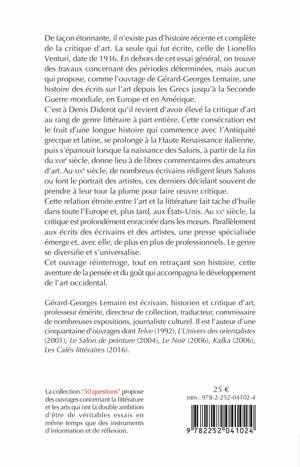 De facon etonnante, il n'existe pas d'histoire recente et complete de la critique d'art. La seule qui fut ecrite, celle de Lionello Venturi, date de 1936. En dehors de cet essai general, on trouve des travaux concernant des periodes determinees, mais aucun qui propose, comme l'ouvrage de Gerard-Georges Lemaire, une histoire des ecrits sur l'art depuis les Grecs jusqu'a la Seconde Guerre mondiale, en Europe et en Amerique. C'est a Denis Diderot qu'il revient d'avoir eleve la critique d'art au rang de genre litteraire a part entiere. Cette consecration est le fruit d'une longue histoire qui commence avec l'Antiquite grecque et latine, se prolonge a la Haute Renaissance italienne, puis s'epanouit lorsque la naissance des Salons, a partir de la fin du XVIIe siecle, donne lieu a de libres commentaires des amateurs d'art. Au XIXe siecle, de nombreux ecrivains redigent leurs Salons ou font le portrait des artistes, ces derniers decidant souvent de prendre a leur tour la plume pour faire uvre critique. Cette relation etroite entre l'art et la litterature fait tache d'huile dans toute l'Europe et, plus tard, aux Etats-Unis. Au XXe siecle, la critique est profondement enracinee dans les moeurs. Parallelement aux ecrits des ecrivains et des artistes, une presse specialisee emerge et, avec elle, de plus en plus de professionnels. Le genre se diversifie et s'universalise. Cet ouvrage reinterroge, tout en retracant son histoire, cette aventure de la pensee et du gout qui accompagna le developpement de l'art occidental.